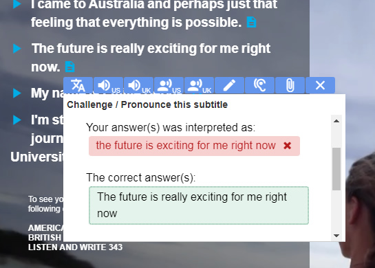 Puede practicar la pronunciación por palabra y la pronunciación por subtítulo haciendo clic en el icono para pronunciar