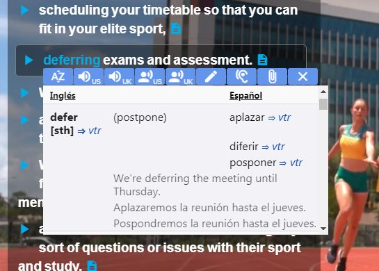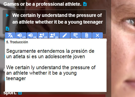 que encontrará en la lección por palabra al hacer clic en cualquier palabra o en la lección por subtítulos en el icono al final de cada subtítulo.